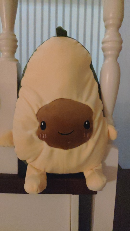 Incredibly soft fabric and somewhat loose stuffing means it's extremely huggable. Had a little difficulty staying sitting upright due to the large avocado butt. Too soft and cuddly for me to care. 5/5