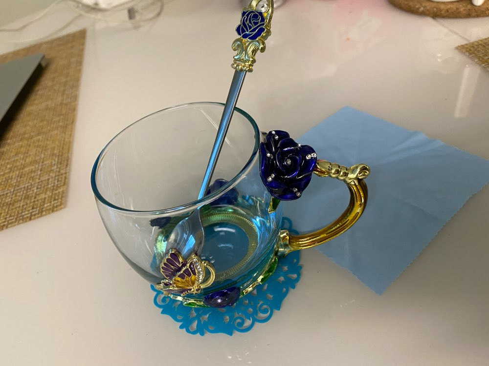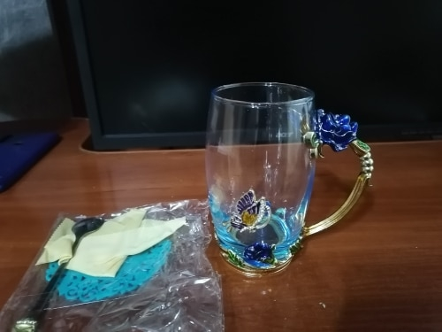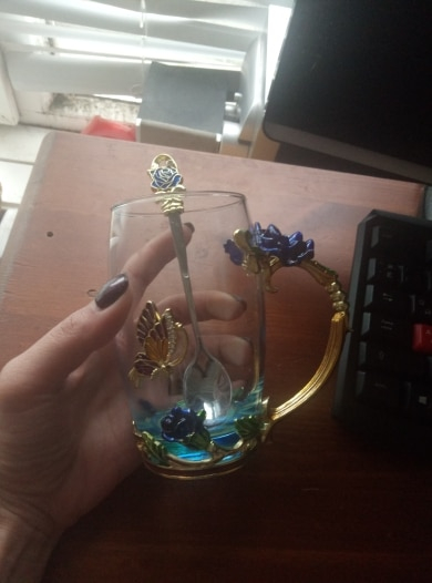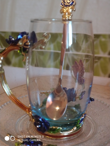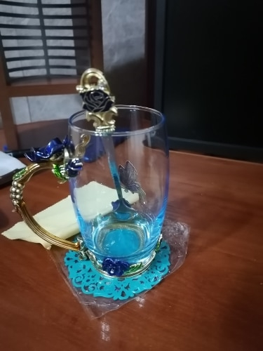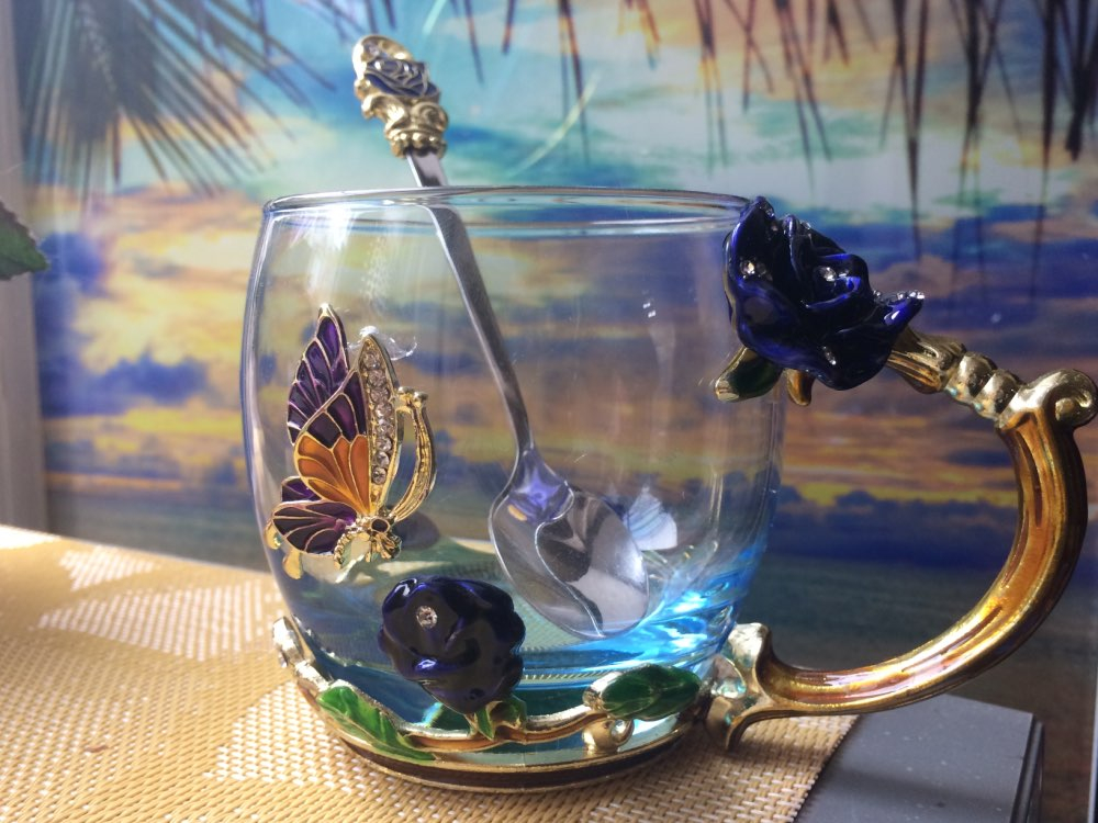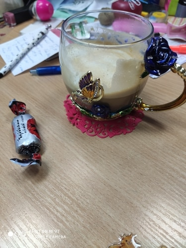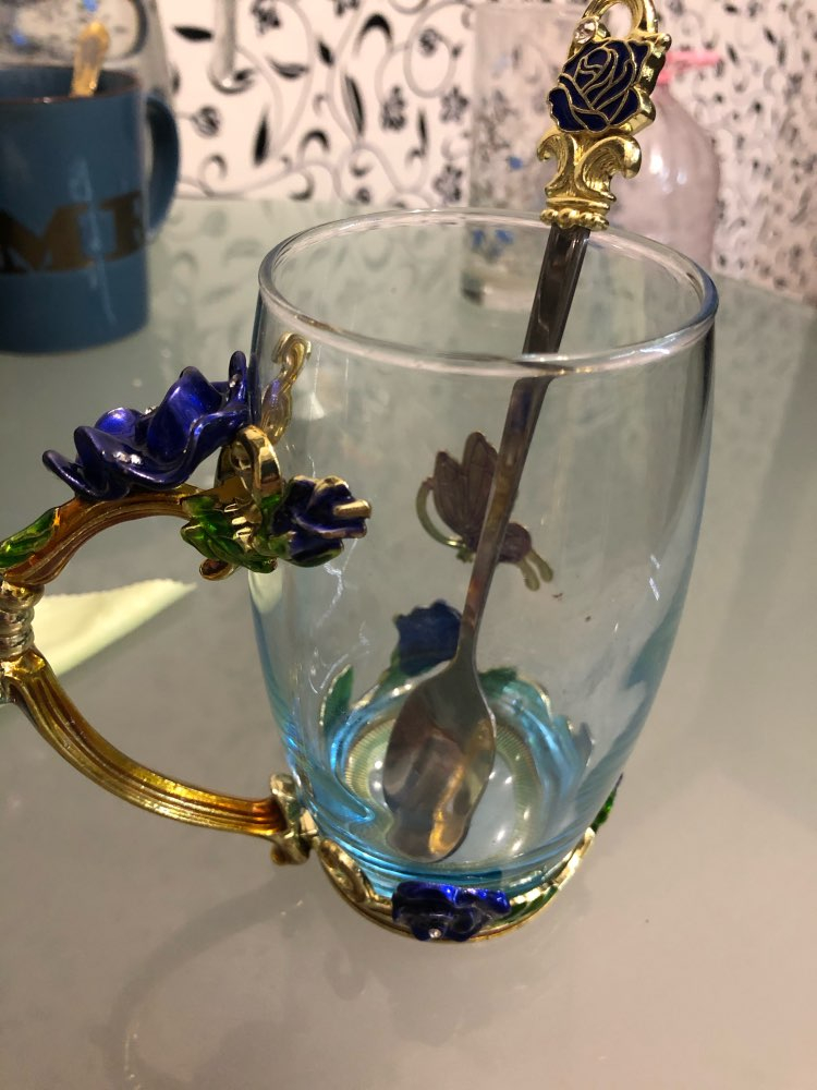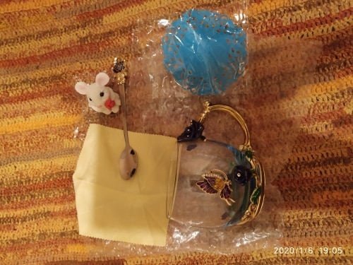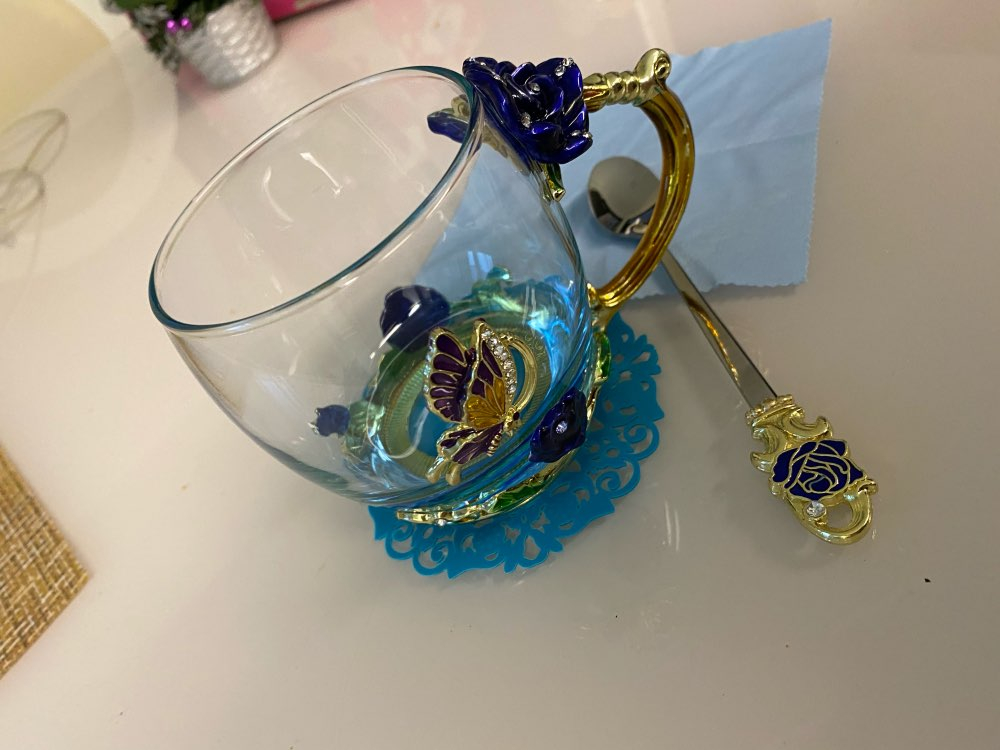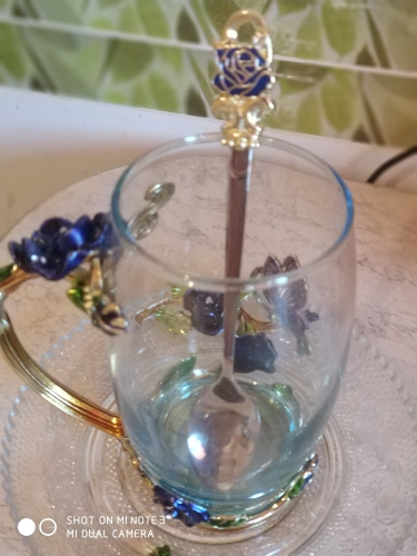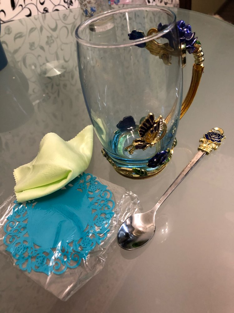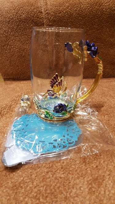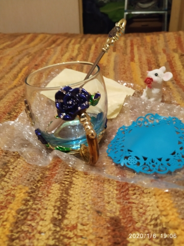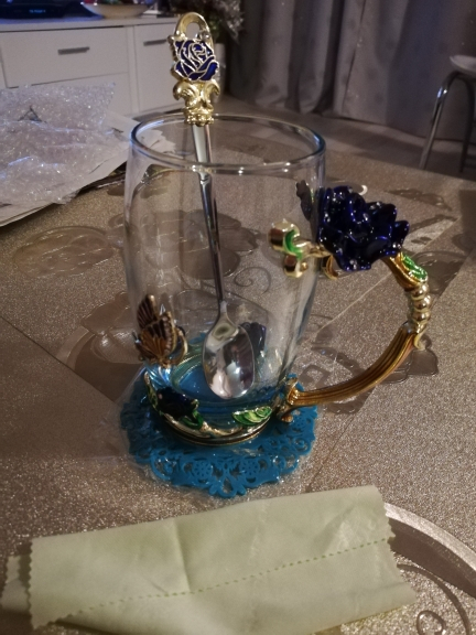 The girl of 20 years was delighted with the mug. I, a person of 40 years, treated calmly)) Gypsy gilding. But made relatively high quality. Everything is glued and painted. Even a butterfly from the inside. On the cup holder you can see traces of the molding (?). Spoon flat. Metal, but light. A small turquoise napkin is silicone. Very, very long shipping. Despite being paid. The store on the contact goes)) good, and he also suggested that local delivery slows down.