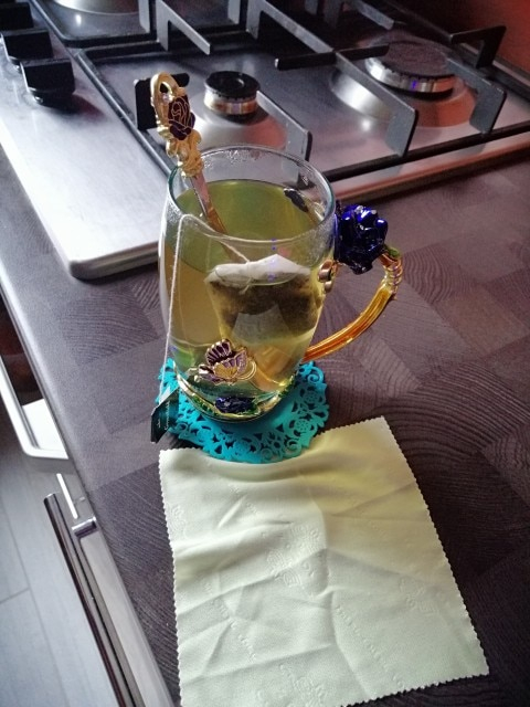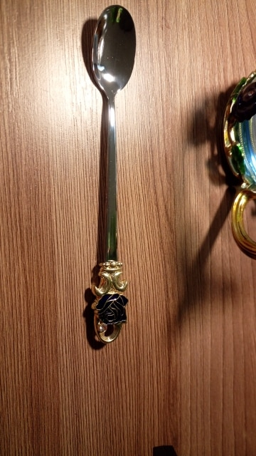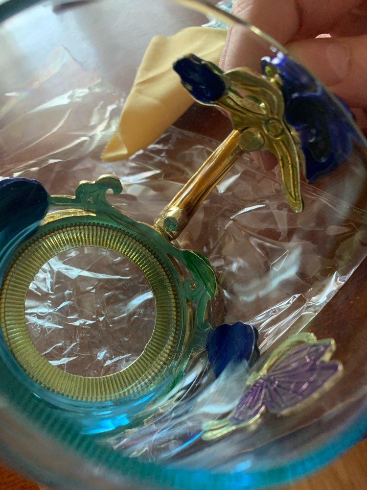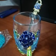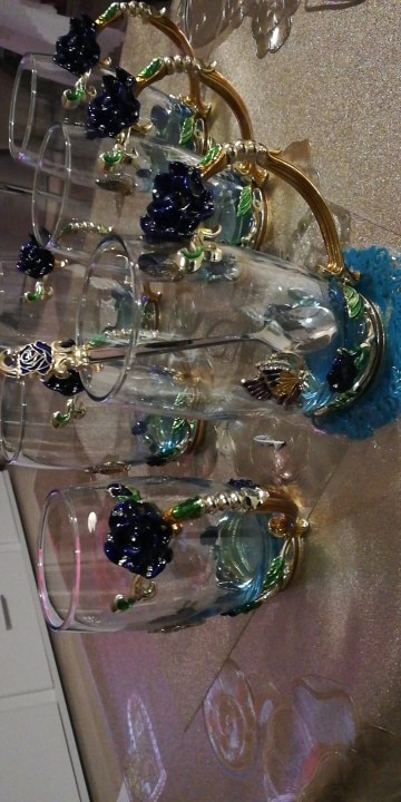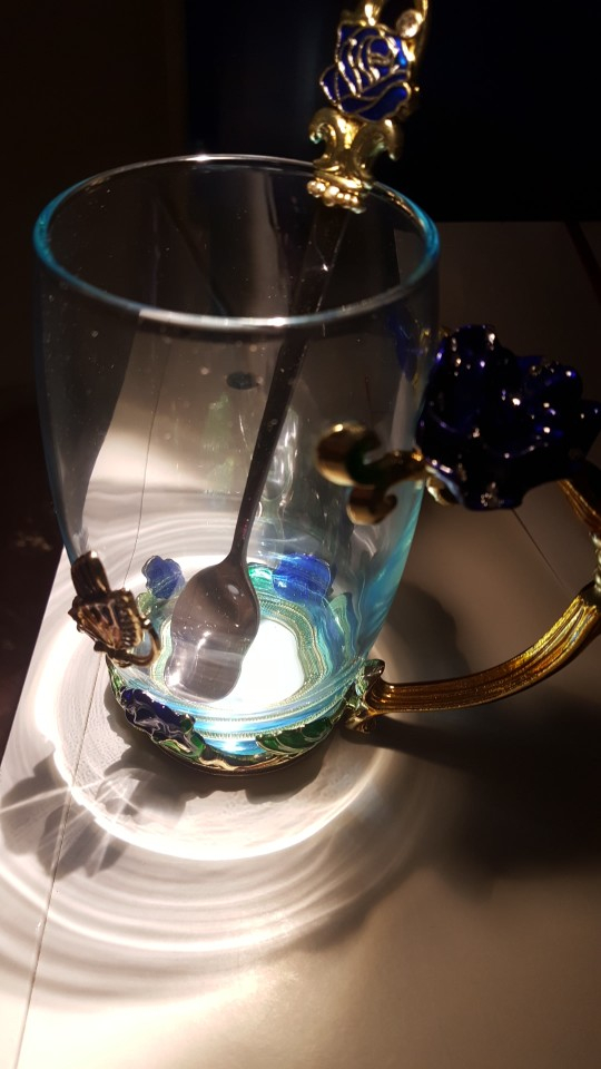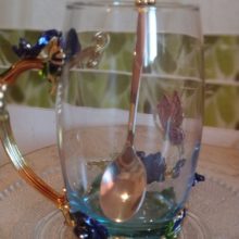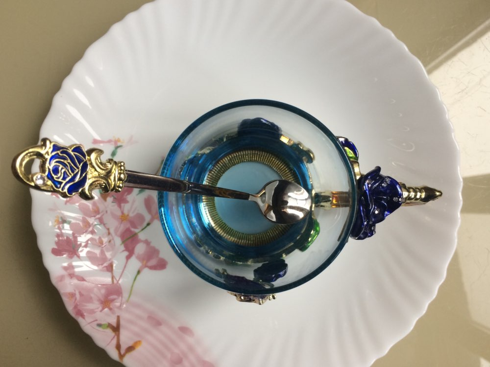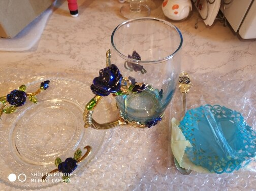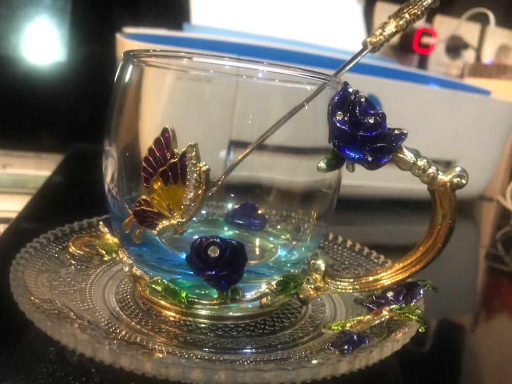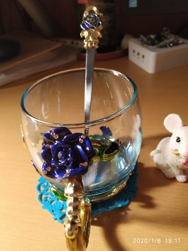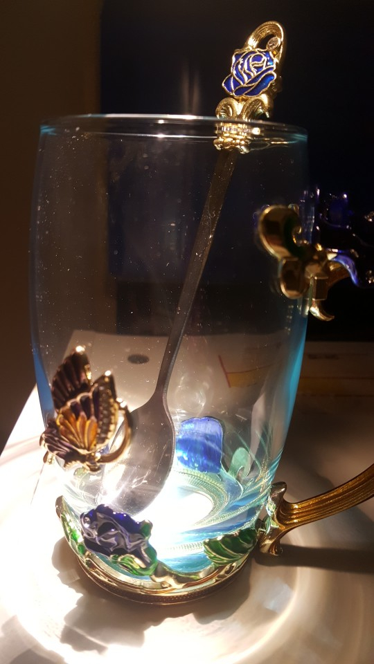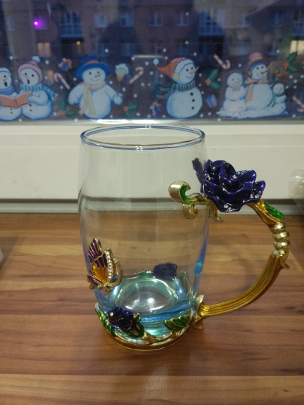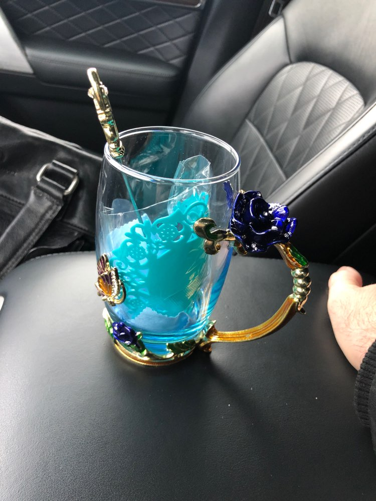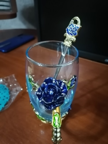 The girl of 20 years was delighted with the mug. I, a person of 40 years, treated calmly)) Gypsy gilding. But made relatively high quality. Everything is glued and painted. Even a butterfly from the inside. On the cup holder you can see traces of the molding (?). Spoon flat. Metal, but light. A small turquoise napkin is silicone. Very, very long shipping. Despite being paid. The store on the contact goes)) good, and he also suggested that local delivery slows down.