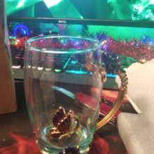 Very beautiful mug, minus the handle heats up. The store put a napkin and a ring under the glass as a gift. Shipping fast