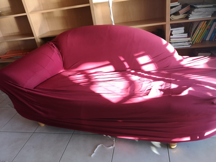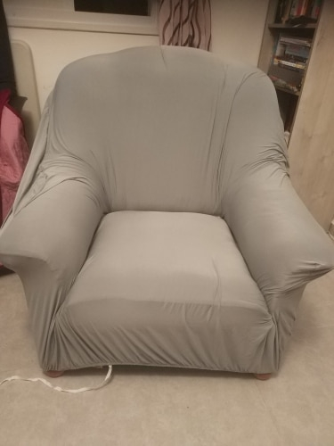Cover that fits very well, sold with cylinders to stall the fabric in the grooves which makes it not move. The fabric is but opaque and very elastic. My couch is like new! Very good value for money!!! Arrived at the expected date